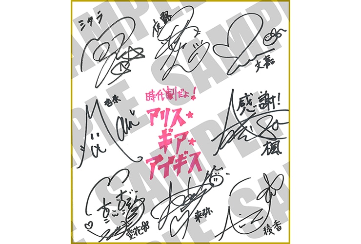 ●『ドラマレコード「時代劇だよ!アリス・ギア・アイギス」限定盤/通常盤』をご予約いただいた方の中から、抽選で1名様に出演キャスト様の寄せ書きサイン色紙をプレゼント!