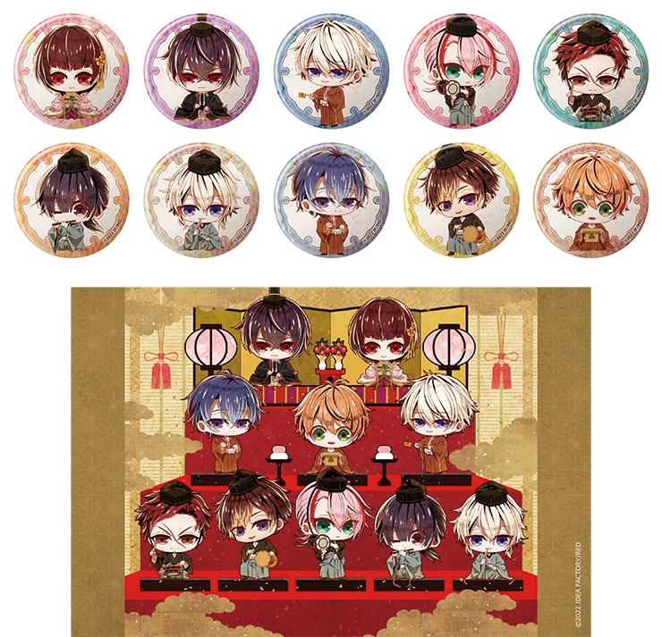 のイラストを使用したちびキャラ缶バッジ10種セットとブロマイド。