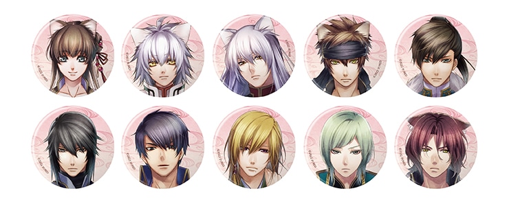 「関羽(主人公)」「劉備(子供姿)」「劉備(大人姿)」「張飛」「趙雲」「曹操」「夏侯惇」「張遼」「諸葛亮」「周瑜」のイラストを使用した缶バッジ10種セット。