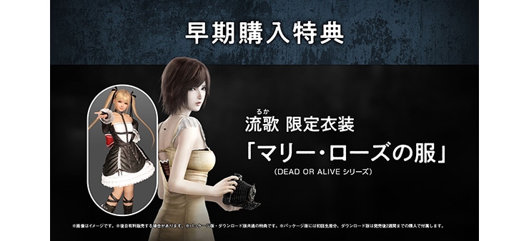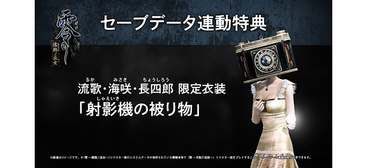 ※『零 ~濡鴉ノ巫女~』(2021年発売リマスター版)のシステムデータが保存されている機器本体で本作をプレイすることでセーブデータ連動特典が入手いただけます。