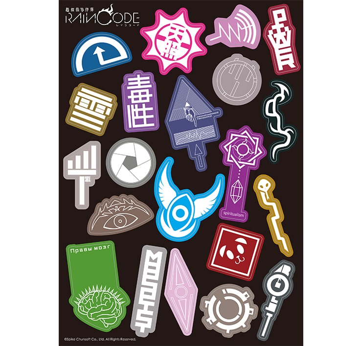 本作に登場するキャラクターや組織のシンボルマークを盛りだくさんに詰め込んだステッカーです。