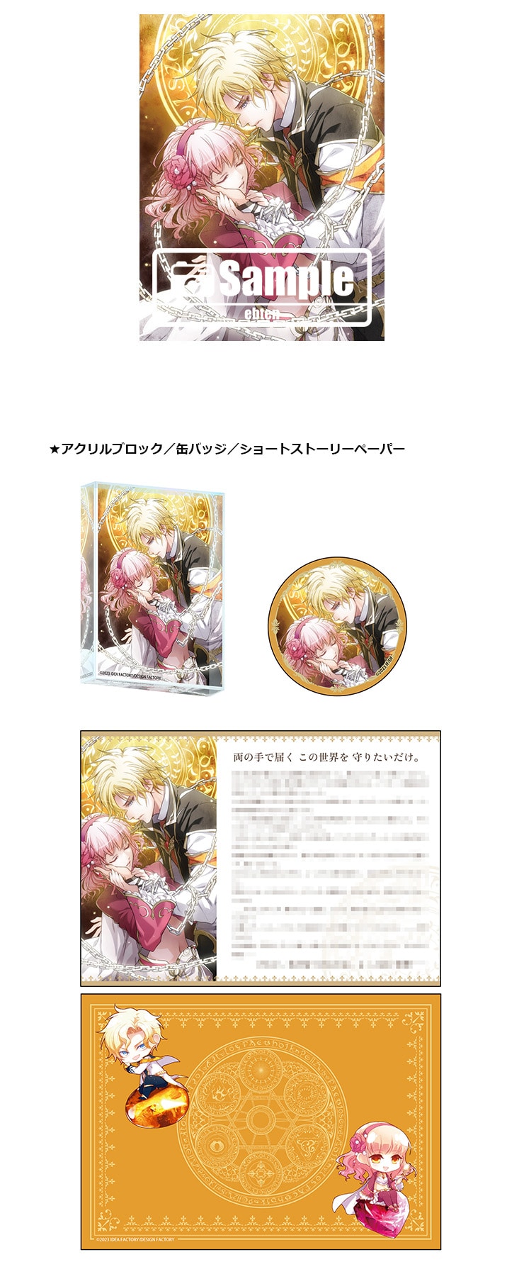 『B's-LOG』2010年9月号から2011年3月号に掲載された、描きおろしイラストと、書きおろしショートストーリーを使用したアクリルブロックと缶バッジ、ショートストーリーペーパーのセットです。ユリウス、ノエル、ビラール、ラギ、アルバロ、エスト、ソロの7種類がございます。
