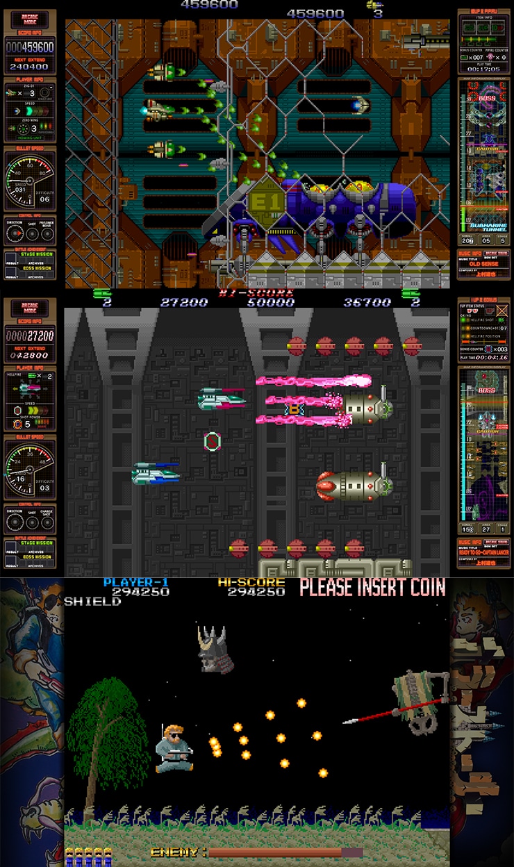 DLCでは「ゼロウイング」「ヘルファイアー」の各種家庭版移植作品を多数収録しました。