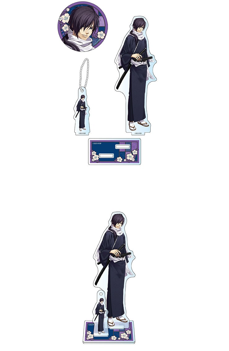 土方歳三、沖田総司、斎藤一、藤堂平助、原田左之助、風間千景の等身イラストを使った缶バッジです。