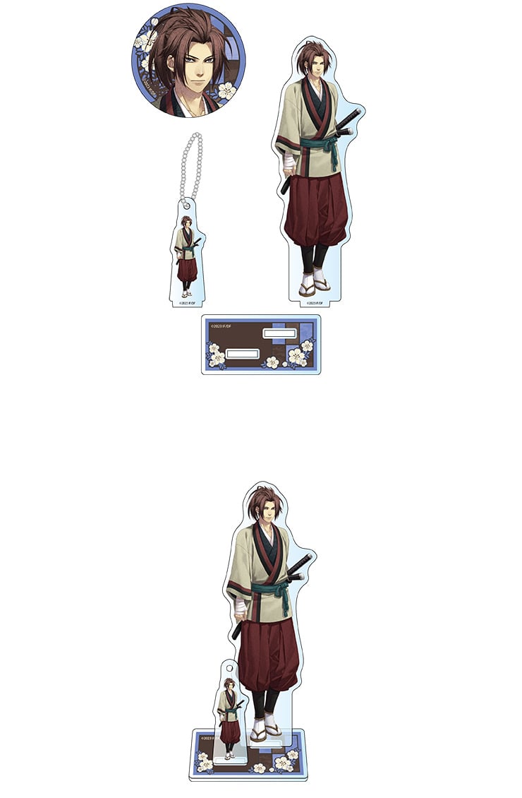土方歳三、沖田総司、斎藤一、藤堂平助、原田左之助、風間千景の等身イラストを使った缶バッジです。