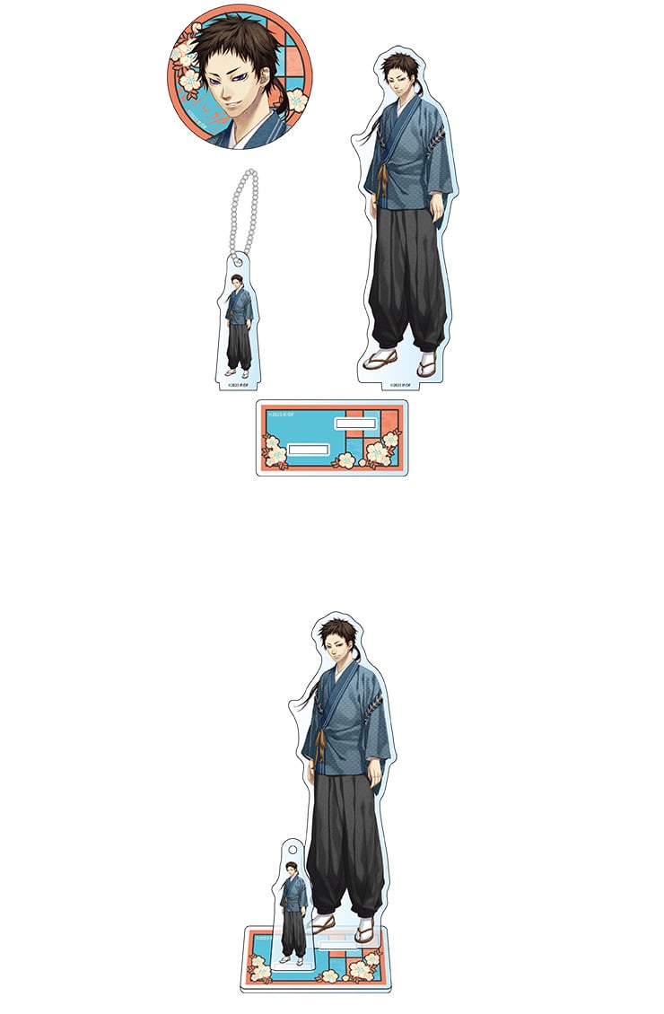 高さ約150mmの大きいアクリルスタンドと、同じイラストの小さいアクリルスタンドを並べて楽しめるアクリルスタンドです。大きいアクリルスタンドは観賞用に、小さいアクリルスタンドはキーホルダーにもできるので、缶バッジと一緒にお出かけに連れ出せる、旦那尽くしの一揃えです。