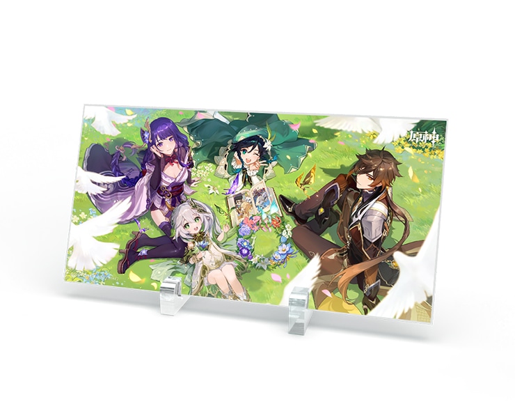 限定版同梱グッズの内容は、ウェンティ、鍾離、雷電将軍、ナヒーダ が描かれた2周年のキービジュアルをあしらったアクリル製のオリジナルメモリアルプレート(縦105mm×横210mm)です!