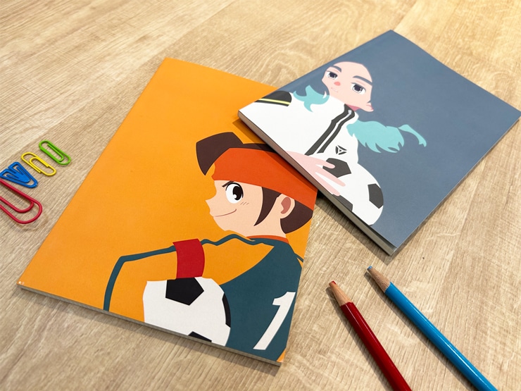 ノート仕上がりサンプル(画像は「円堂 守」デザインと「笹波 雲明」デザインの見本です)