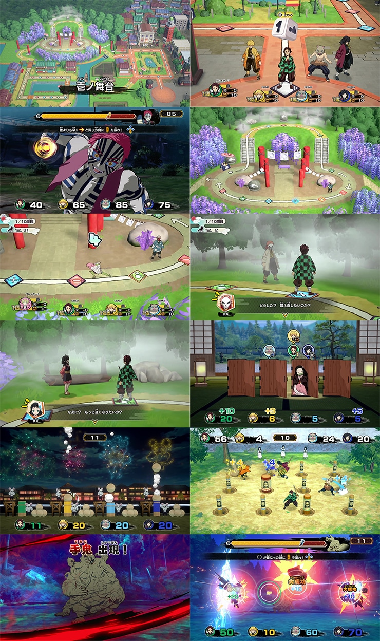ボードには昼と夜の時間帯があり、昼はイベントやミニゲームを行いながら夜に向けて準備し、夜は鬼を探索し倒すことで他プレイヤーよりも鬼殺隊士として活躍することを目指そう!
