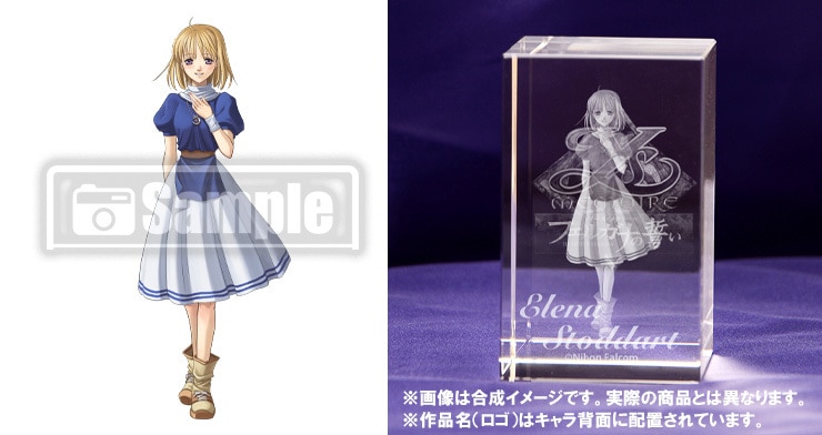 本作のヒロイン「エレナ・ストダート」のビジュアルをクリスタルキューブ内に3D立体レーザー彫刻で再現した3Dクリスタルです。
