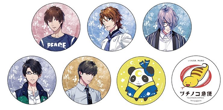 「迦具土 ヒノ」「甘梨 イソラ」「櫛奈雫 トア」「建比良 ソウスケ」「叢雲 ユヅキ」「奥音パンダ」「ツチノコ急便」のイラストを使用した缶バッジです。