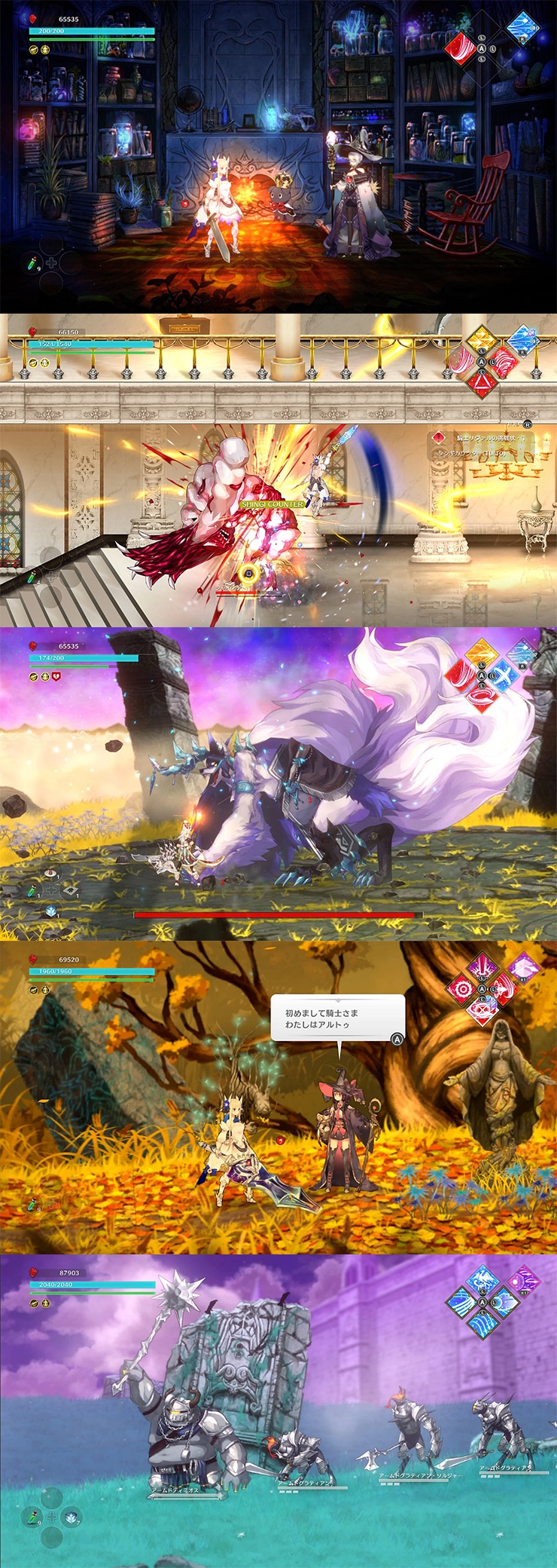 武器はそれぞれ固有の必殺技「シンギ」を有しています。自分の好きなシンギを組み合わせて、自分だけの騎士をつくることができます。タイミングよくシンギを発動し、敵を攻撃することで、相手をダウンさせ、一方的に攻撃を加えることが可能です。