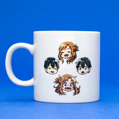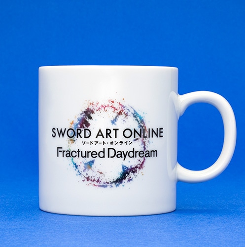 『ソードアート・オンライン フラクチュアード デイドリーム』のロゴとテリアちゃんねるでおなじみのam.氏が手掛けたちびキャラが描かれたオリジナルマグカップ