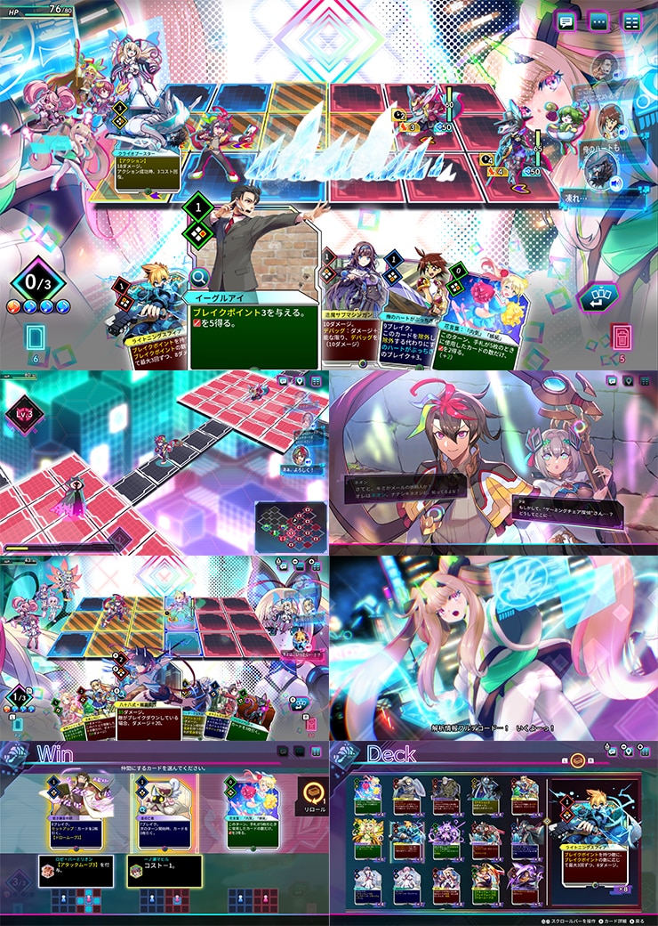 自由に歩き回れる電脳世界(ダンジョン)では、バトルに勝利する度に入手できる《キャラクターカード》で満足するまで《デッキ》を強化し、出現する敵やボスをローグライト・カードバトルで撃退します。
