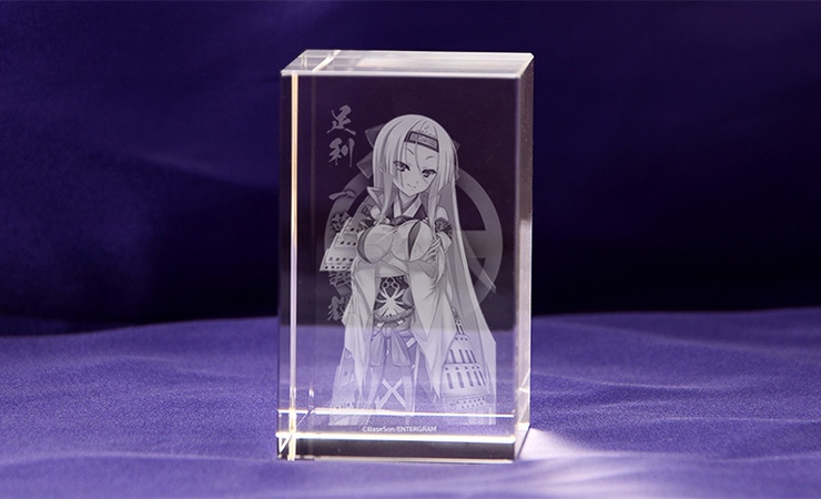 「足利一葉義輝」のビジュアルをクリスタルキューブ内に3D立体レーザー彫刻で再現した3Dクリスタルです。