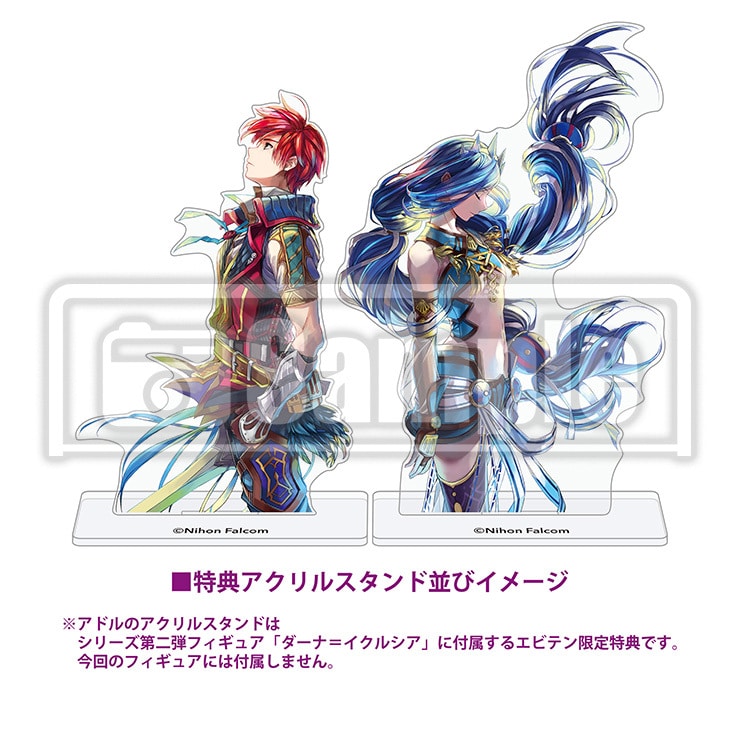 さらに今後発売が予定されているシリーズ第二弾フィギュア「ダーナ=イクルシア」にも、エビテン限定特典として同様のビジュアルを用いたアドルのアクリルスタンドが付属予定。