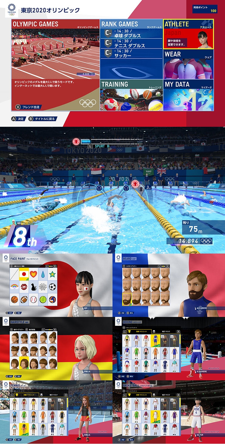 世界的に人気の競技を15種目以上収録し、本格的なスポーツアクションがお楽しみいただけます。ゲーム内では、オリンピックスタジアムをはじめとした実際の競技会場をリアルに再現。自らの分身となるアバターを作成し、プレイヤーキャラクターとして操作することができるので、誰でも “東京2020オリンピック”に参加するという、唯一無二の体験が可能です。