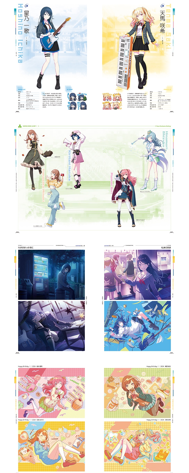 2023年10月以降に実装されたイベントイラストのほか、ライブやイベント用に制作されたイラスト、各種ゲーム内素材などなど、多彩なビジュアル素材をたっぷりに収録。登場人物たちの関係性がわかる相関図ほか、キャラクター情報も掲載しています。