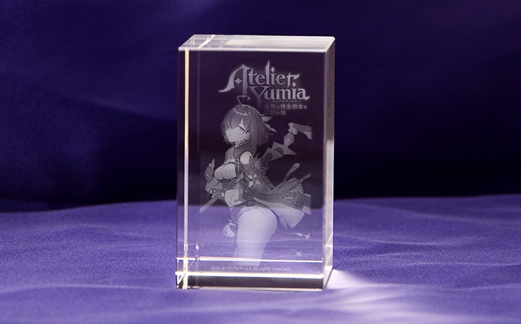主人公「ユミア」のビジュアルをクリスタルキューブ内に3D立体レーザー彫刻で再現した3Dクリスタルです。