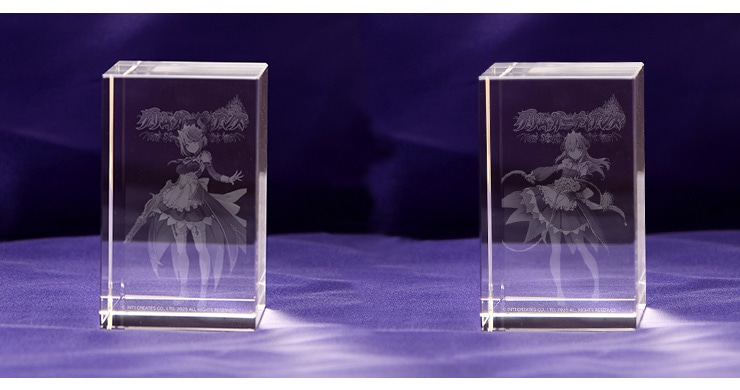 本作の主人公「キリカ」と「マーシャ」のビジュアルをクリスタルキューブ内に3D立体レーザー彫刻で再現した3Dクリスタルです。