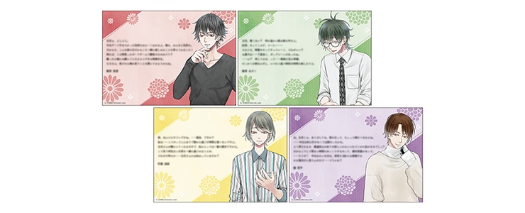 「蘇芳 笑男」「緑青 あすく」「朽葉 成臣」「藤 雪平」のイラストを使用した、メッセージ入り2L判ブロマイド4種セットです。