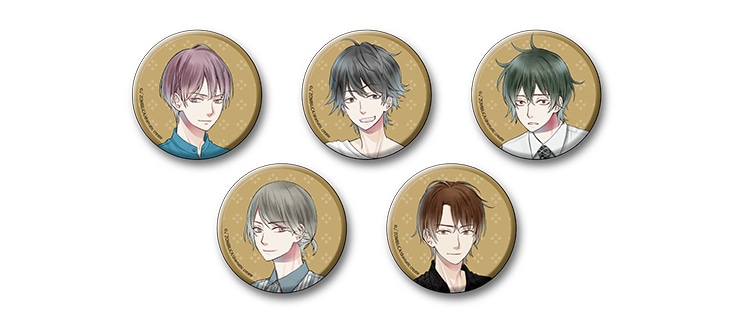 「清澄 日天」「蘇芳 笑男」「緑青 あすく」「朽葉 成臣」「ココ」のイラストを使用した、缶バッジ9種セットです。