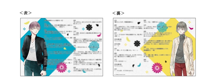 「清澄 日天」「朽葉 成臣」のイラストと書き下ろしショートストーリーをお楽しみいただけるカードです。