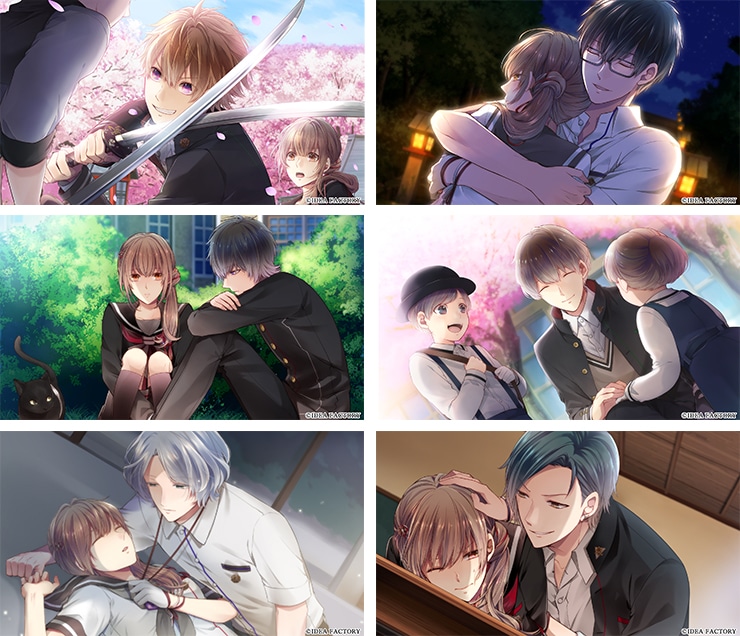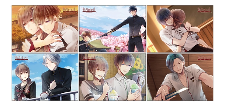 主人公、弐藤 光、壱園 央助、肆形 有比、漆原 景太郎、陸平 崇樹、玖折 巡のゲーム内スチルを配した2L判ブロマイド6種セットです。