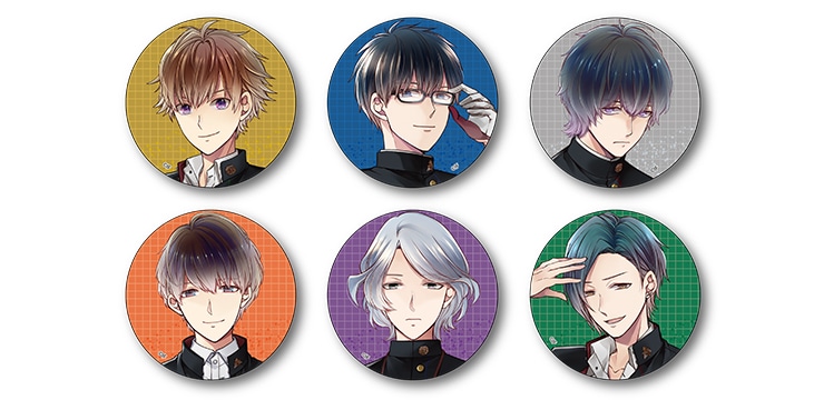 弐藤 光、壱園 央助、肆形 有比、漆原 景太郎、陸平 崇樹、玖折 巡の等身イラストを使った缶バッジです。