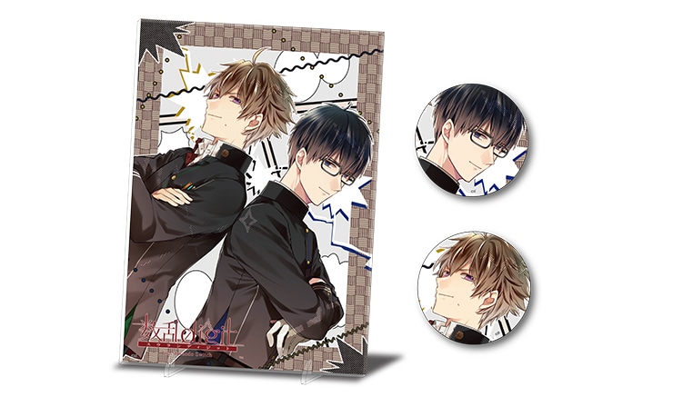 「弐藤 光」「壱園 央助」の描き下ろしイラストを使用したアクリルパネルと缶バッジです。