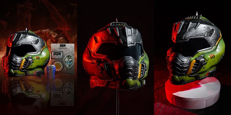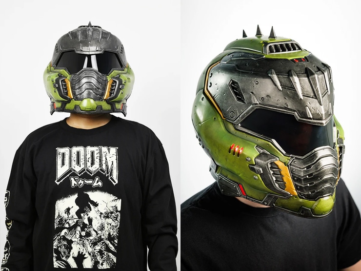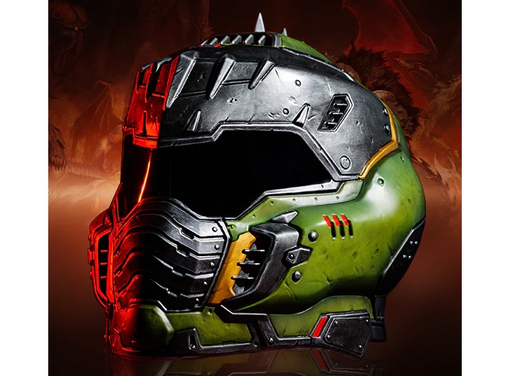DOOM Slayerのオリジンストーリーに登場するヘルメットを、細部まで忠実に再現したウェアラブルレプリカ。独特のフォルムや質感、戦闘によるダメージの表現に至るまで丁寧に仕上げられており、LED発光ギミックも搭載。