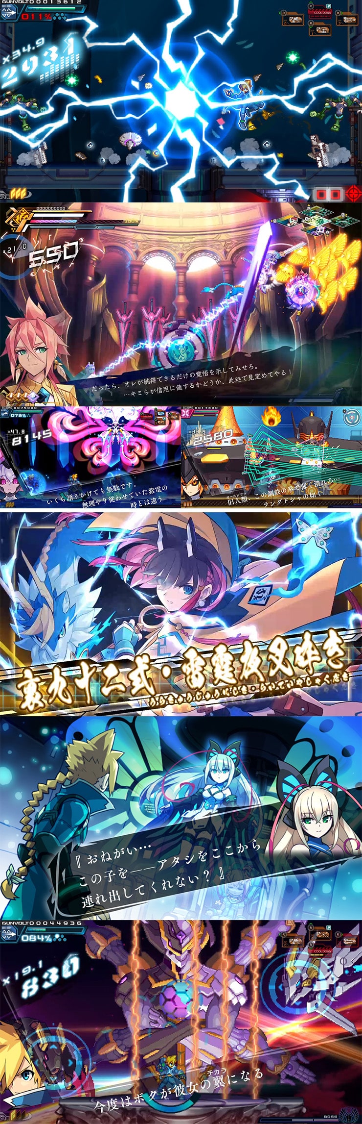 プレイヤーであるガンヴォルトは雷撃の“第七波動(セブンス)”を使い、自由のため皇神グループや多国籍能力者連合エデンの能力者たちと激しいバトルを繰り広げます。