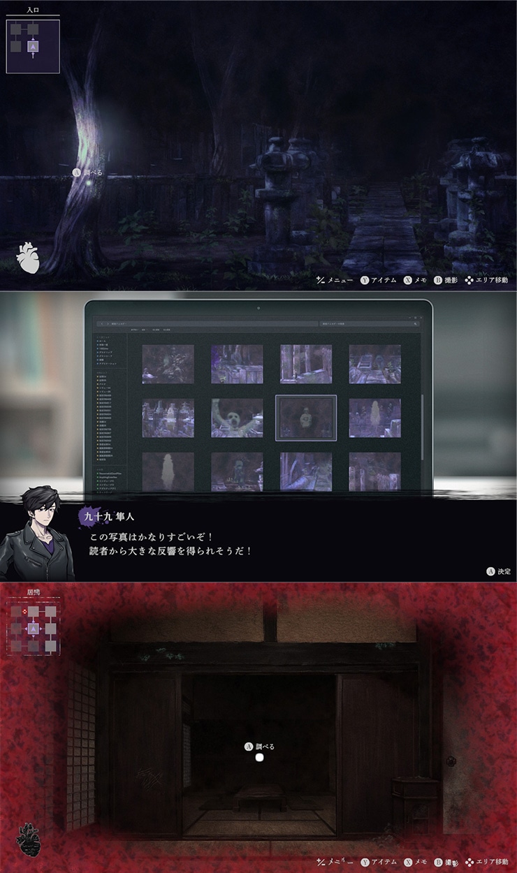 主人公は呪いに心身を苛まれています。心霊スポットで霊の撮影に失敗したり、長時間探索を続けると主人公の受けている呪いが進行してしまいます。
