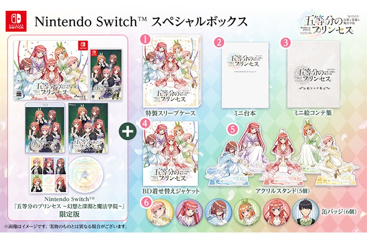 スペシャルボックスには限定版に同梱されるオリジナルアニメBlu-ray Disc、サウンドトラック(DVD-ROM)、スペシャルブックレットに加えて、アクリルスタンド(5個)、缶バッチ(6個)、BD着せ替えジャケット、ミニ台本、ミニ絵コンテ集、特製スリーブケースを同梱します。