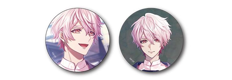 「逸色 珠沙(主人公)」「天堂 紅華」「伊音 響」「秋月 香羊」「水鏡 星絆」「魅ナミ」「聖夜・オディロ・柚木永」「幸麿」「狐春」「久遠 桃嘉」のイラストを使用したちびキャラ缶バッジ10種セットです。