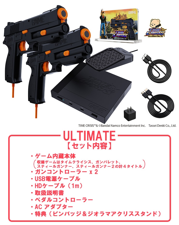 ・特典として、達成電器マスコットキャラクターのKOMUGIと「タイムクライシス」コラボレーションオリジナルピンバッジと更に、「タイムクライシス」30周年記念オリジナルアクリルジオラマスタンドを同梱!