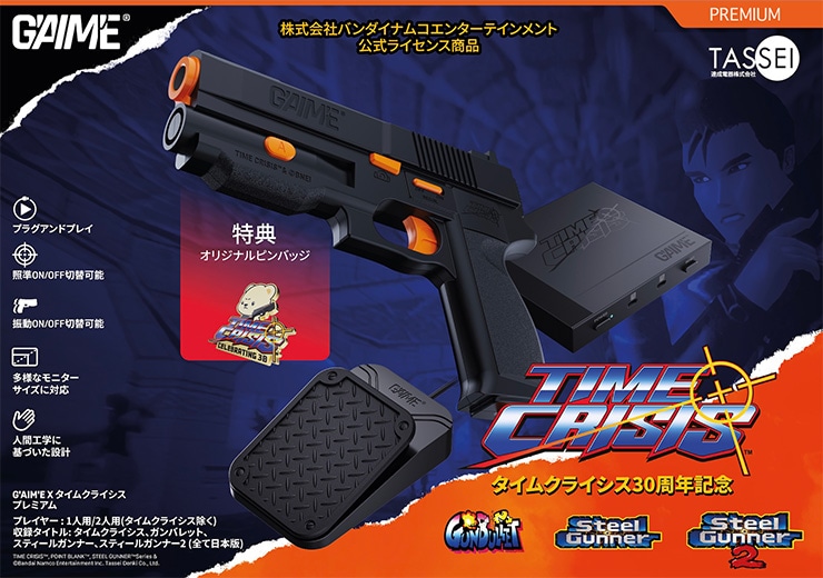 ・特典として、達成電器マスコットキャラクターのKOMUGIとタイムクライシスコラボレーションオリジナルピンバッジを同梱。