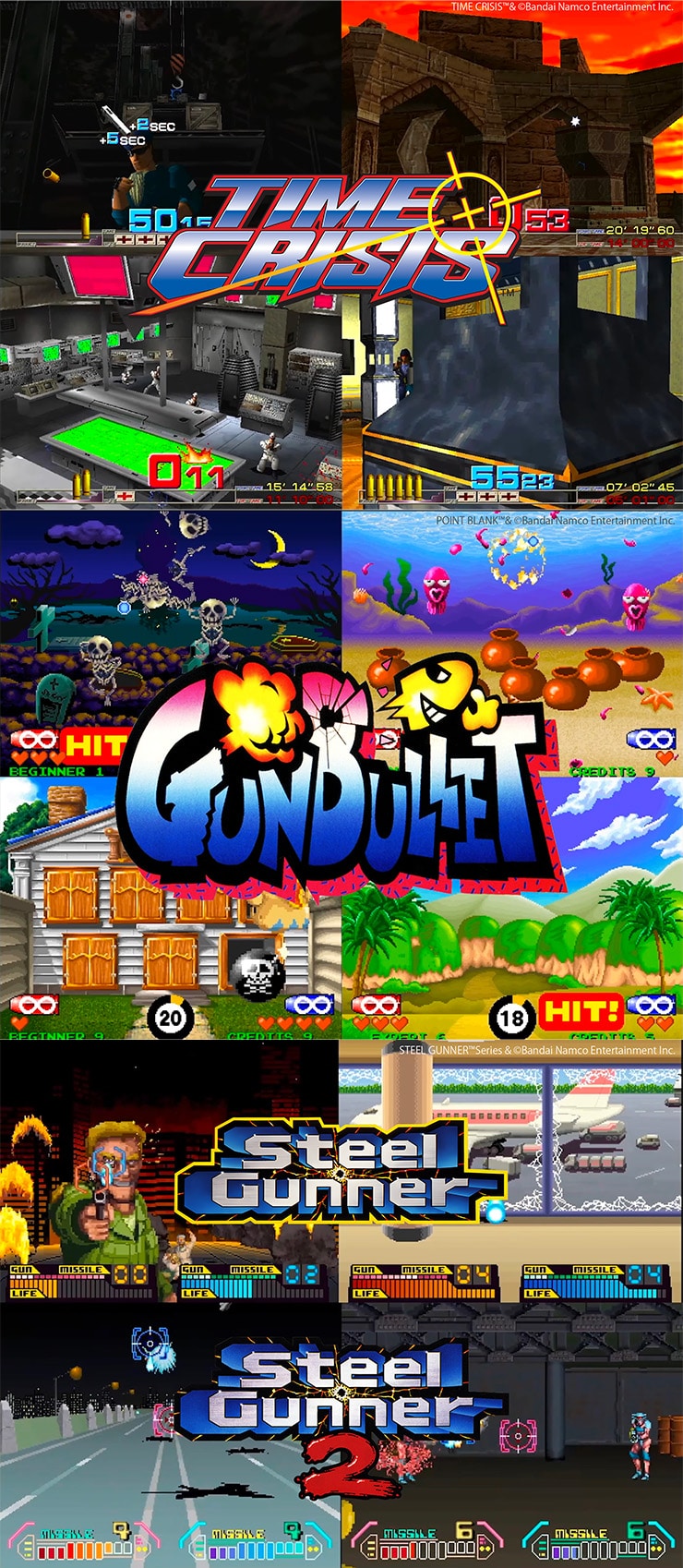 ・収録タイトル:タイムクライシス、ガンバレット、スティールガンナー、スティールガンナー2の計4タイトル(全て日本版 ※タイムクライシスは1人プレイ)