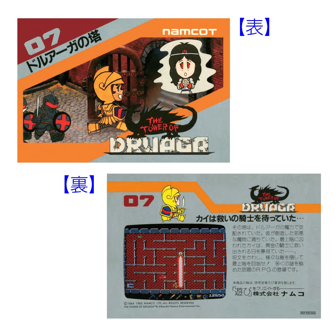 ナムコ(現・バンダイナムコエンターテインメント)の家庭用ゲーム機向けソフトのブランド“ナムコット”から発売されたファミリーコンピュータ用ソフト『ドルアーガの塔』の外箱をモチーフとしたデザインを採用しました。ブランケットは両面印刷で、サイズは1044mm×700mm。外箱の表面と裏面のデザインを可能な限り忠実に再現しているのが特徴。また、ブランケットの外箱(A4サイズ)にも各タイトルの外箱デザインを採用しているほか、ナムコットのファミコンソフト30タイトルをまとめたA5サイズの16ページの冊子も同梱されています。