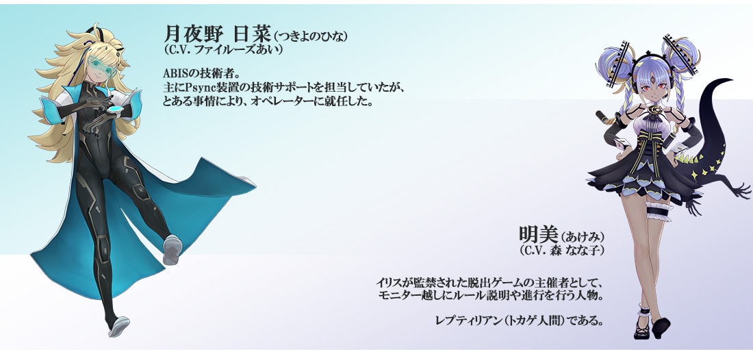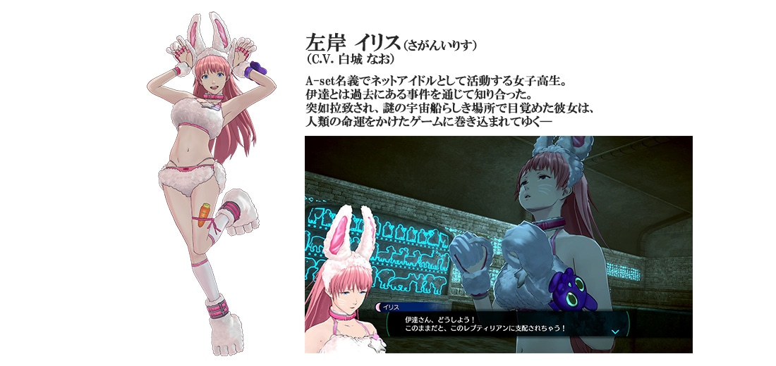 ネットアイドル「A-set」こと「左岸 イリス」が脱出パートのプレイアブルキャラクターとして登場します。