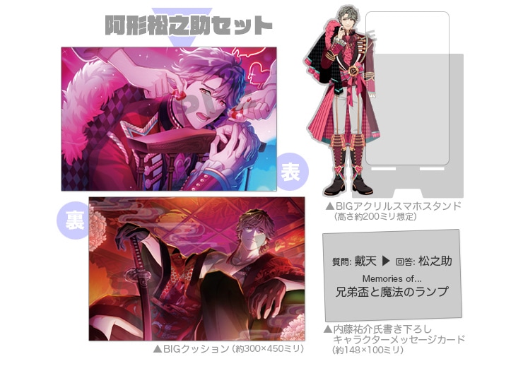 こちらのグッズは、bslog.comにて実施したユーザー投票で選ばれたイベント「★3/★4 カオストーンイラスト」&「イベント衣装」を使用した、BIGクッション&BIGアクリルスマホスタンド!