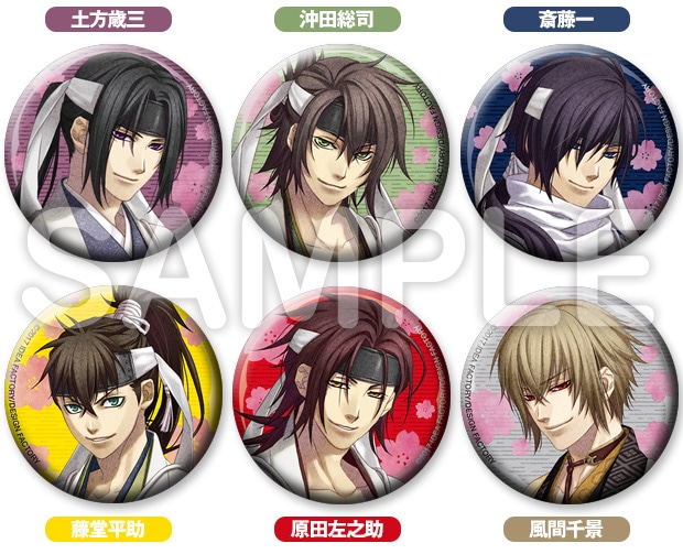 「土方歳三」「沖田総司」「斎藤一」「藤堂平助」「原田左之助」「風間千景」の6人を缶バッジにした6個セット。
