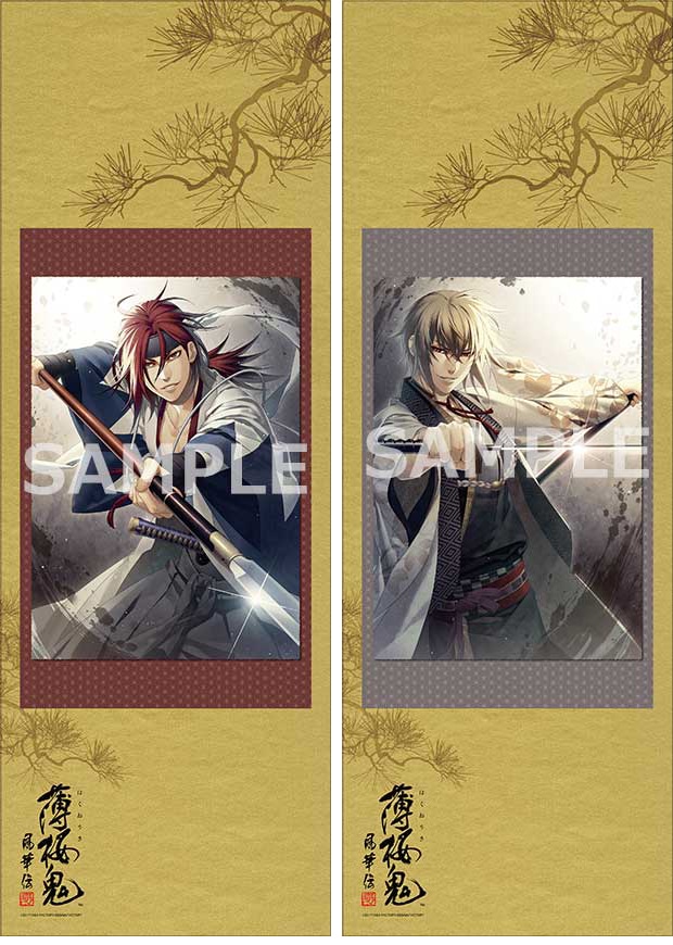 「原田左之助」、「風間千景」の描き下ろしイラストを使用し、それぞれB2半裁サイズのタペストリーに仕上げます。