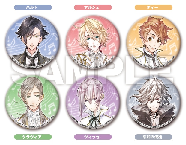 「ハルト」「アルシェ」「ディー」「クラヴィア」「ヴィッセ」「忘却の使徒」の6人を缶バッジにした6個セット。