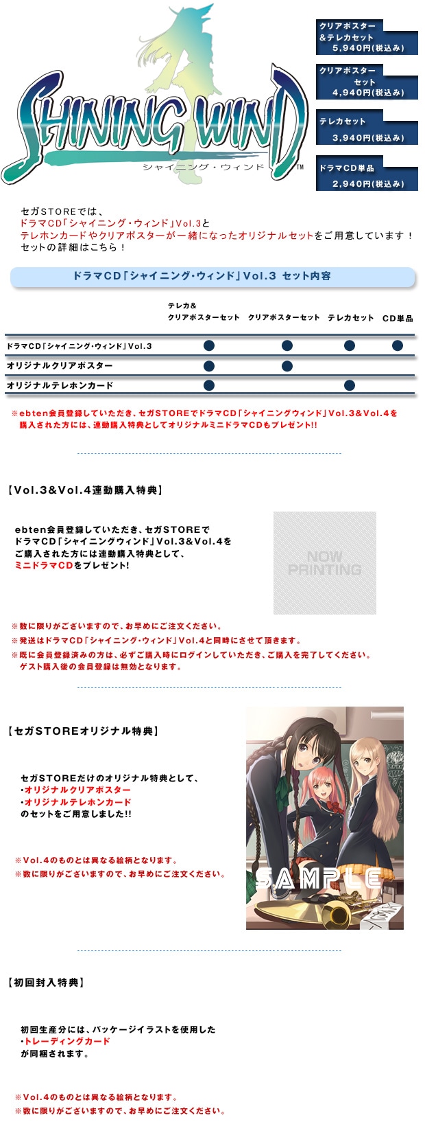 PlayStation2用ゲームソフト「シャイニング・ウィンド」、待望のドラマCD第3弾!!セガの原案・監修による、完全オリジナルストーリー!!下記2点のセット商品になります。・ドラマCD「シャイニング・ウィンド」Vol.3・オリジナルクリアポスター