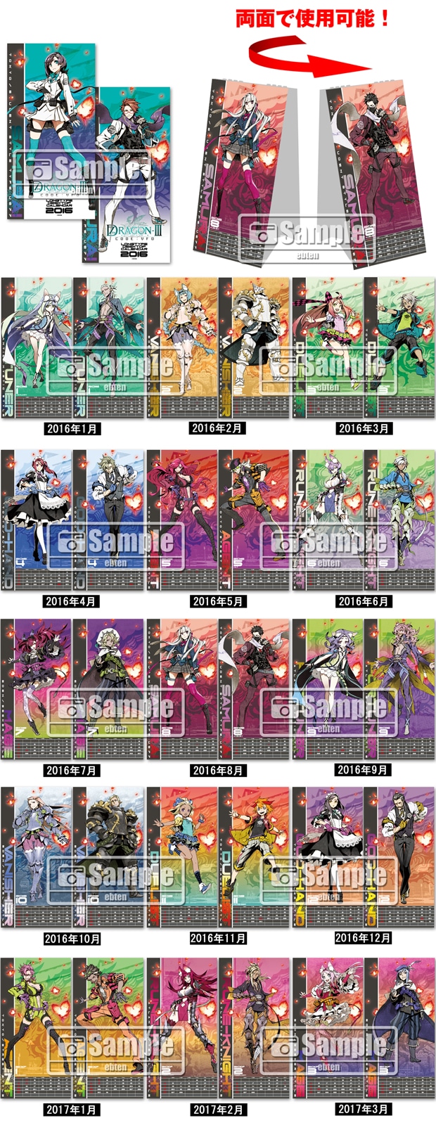 『セブンスドラゴンIII code:VFD』のプレイヤーキャラクター全32種のイラストをデザインした卓上カレンダー。三輪士郎氏による美しいキャラクタービジュアルを大判(縦300×横150mm)サイズで楽しめる、両面印刷で毎月2柄、合計32柄楽しめる豪華仕様です。