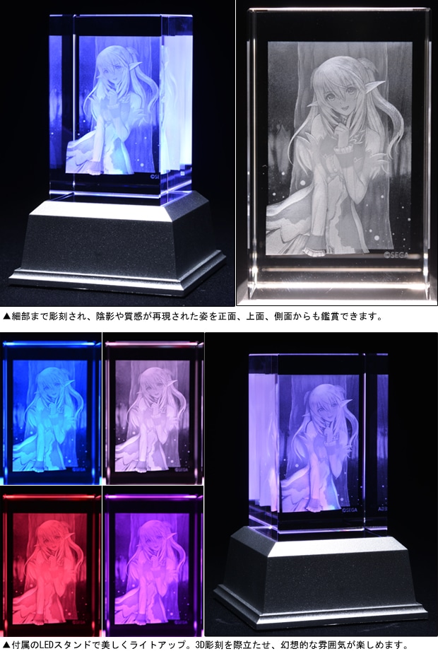 小説『シャイニング・ブレイド 剣士たちの間奏曲』(ファミ通文庫)の表紙カバーを飾ったアルティナのイラストを、クリスタルキューブ内に3D立体レーザー彫刻で再現!付属のLEDスタンドに設置することにより、光の加減や角度によってさまざま な見え方をしますので、煌びやかで飽きのこないインテリアアイテムとして楽しめます。