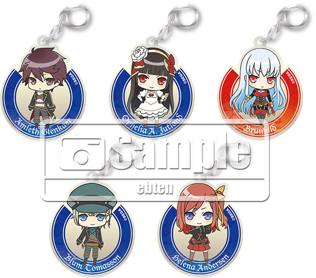 本作の主要キャラクターであるアムレート、オフィーリア、ブリュンヒルデにくわえ、公式BLOG 陣中日誌を綴るブルム、ヘレナ、合計5名のかわいらしいデフォルメイラストをあしらったアクリルキーホルダー5種セットです。