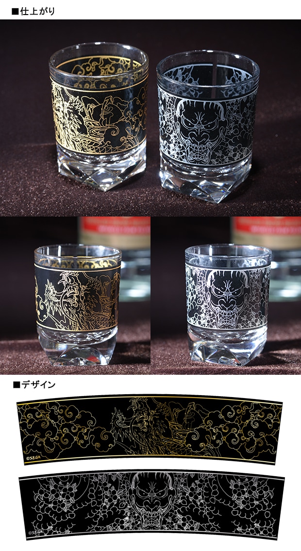 桐生一馬の昇り龍、そして真島吾朗の般若。『龍が如く』シリーズを彩る両名の刺青がそれぞれデザインされたショットグラス2個セットです。