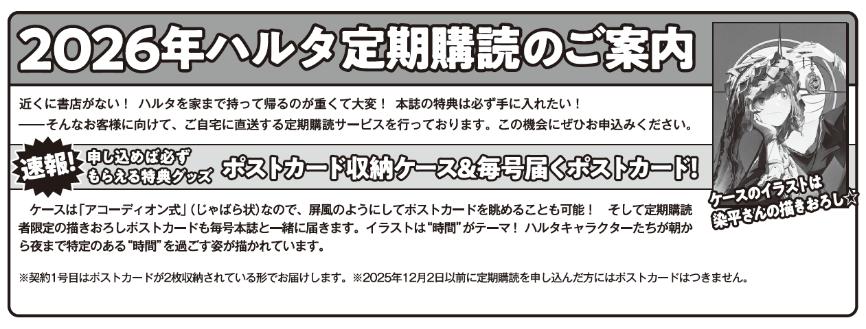 ・2026年9月までに、エビテン〔ebten〕での『ハルタ 年間定期購読』から継続してご注文いただいた方には、お得なクーポンを配布予定です。カドストで『ハルタ(定期購読1年・10冊)』をご注文いただく際に、エビテン〔ebten〕購読時のご注文コードをご入力いただければ、ご注文してから約1ヶ月以内にカドストで使用できる【825円クーポン】をカドストのマイページにて配布いたします。